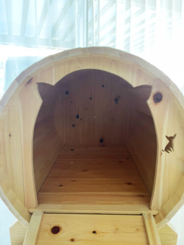 このバレル型犬用ハウスは、大津工務店が提供しているヒノキのバレルサウナと同じ構造・加工技術をもとにしています。
